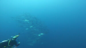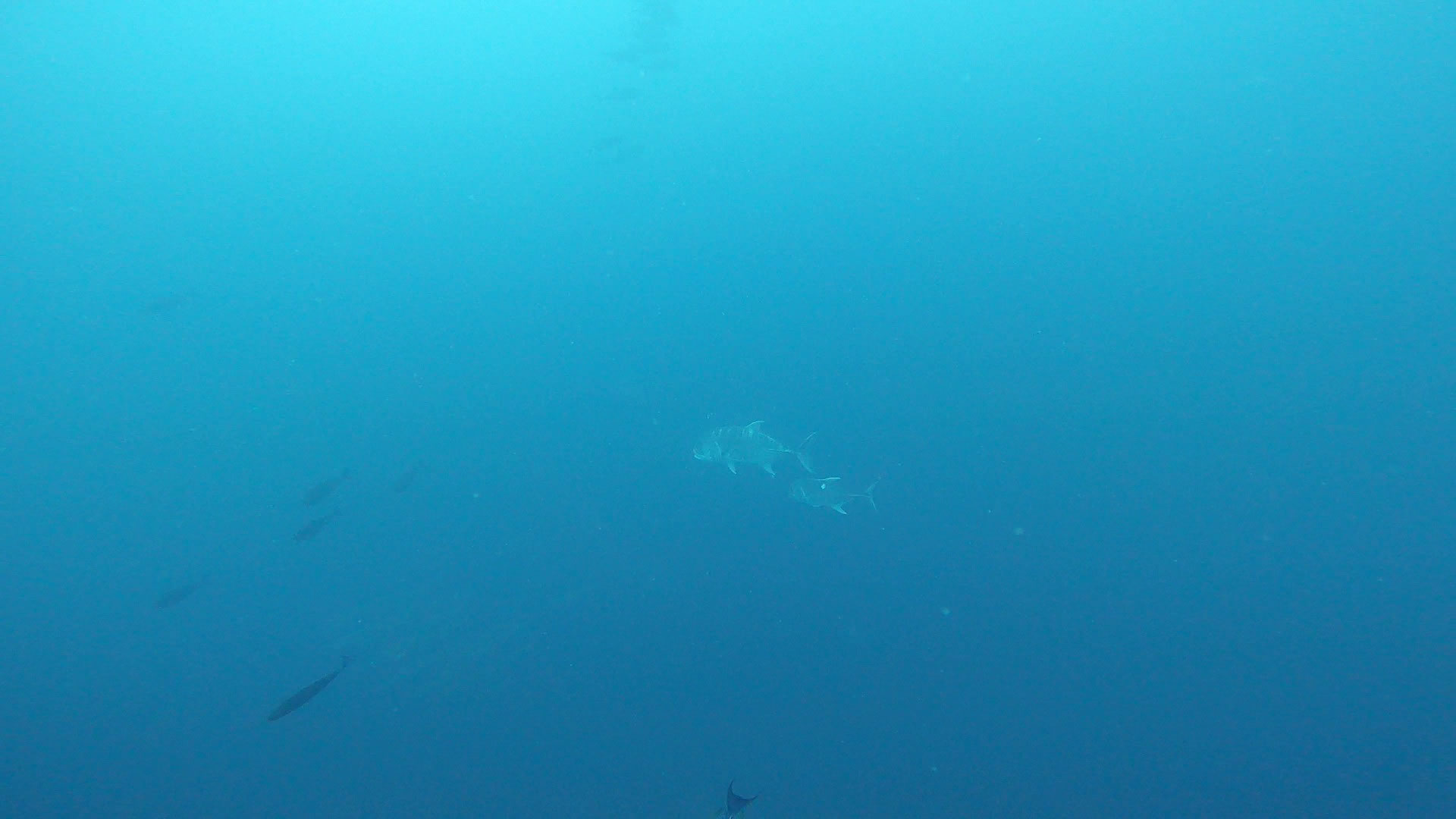 本日も3ダイブドリフトダイビングでございます! しかし・・・ヨナラ水道の透明度は昨日と同じく悪し、さらにマンタは居ない・・・ コテンパンにやられた1&2ダイブ目でした。参った参った。 野原曽根は定番の、ギンガメアジ・ブラックフィンバラクー・ロウニンアジ・イソマグロなどで、 楽しませんてくれました!